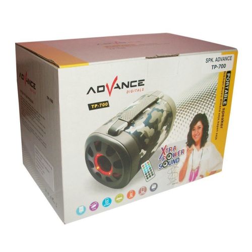 Kini Advance menghadirkan inovasi speaker portable terbarunya yaitu Speaker Portable Advance TP-700. Alat pemutar musik yang dapat memutarkan musik dari kartu memory mini SD/TF CARD/Flashdisk USB dilengkapi dengan FM Radio. Kotak musik konsep baru ini terintegrasi portable stereo kotak musik dan aux untuk menghubungkan MP3, MP4, CD, DVD, IPOD, IPHONE, GPS, PSP, Handphone, Laptop, PC Anda. Didalamnya dilengkapi kabel audio untuk menghubungkan ke PC/laptop anda dan kabel 5 pin USB untuk mengisi daya battery serta dilengkapi remote control sehingga anda bisa mengatur pemakaian speaker anda dari jarak jauh.
