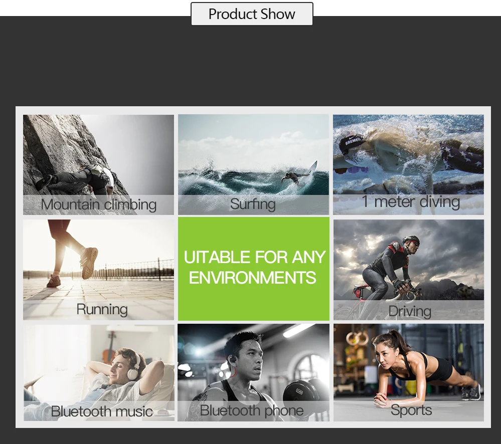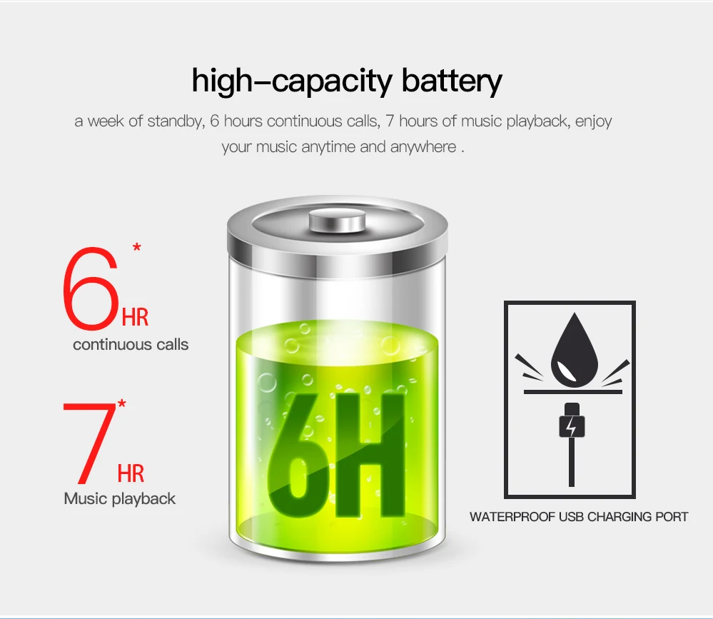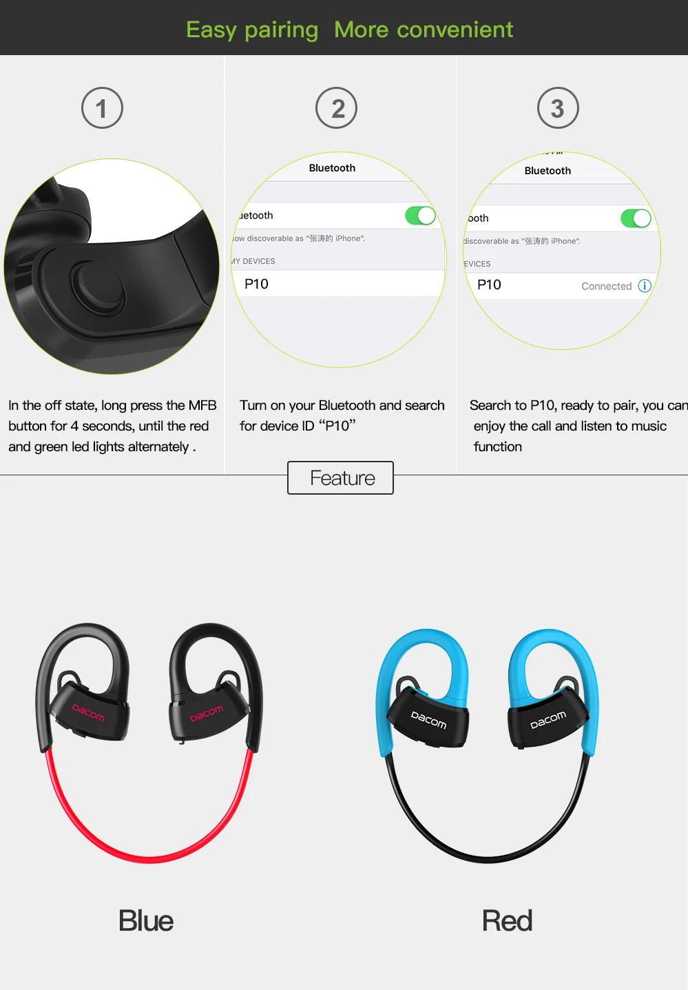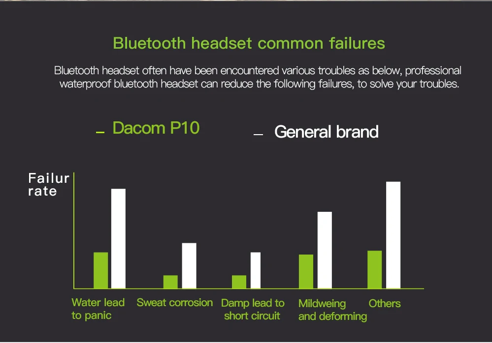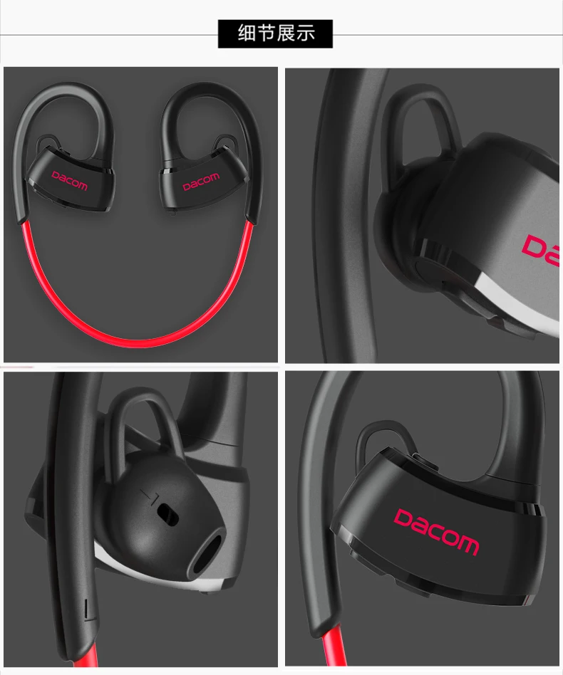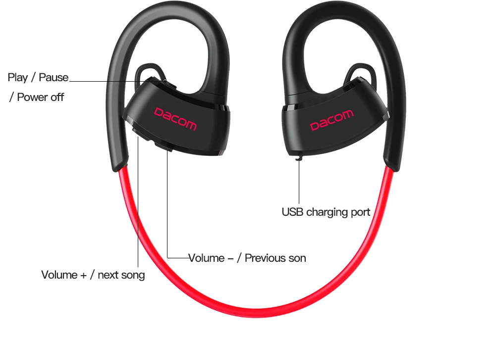 | English description | DACOM P10 Bluetooth Headphone IPX7 Waterproof Bluetooth Headset Sports Wireless Earphone Stereo Running Earbuds for iPhone 7 5 6IPX7 Sweat and Water Proof Swimmable Bluetooth Headset for the use under 1-meter-deep water Item:Sport Bluetooth Headset Bluetooth Standard:V4.1 Charging means:USB charge DC5V Battery:High-capability rechargeable lithium polymer battery Bluetooth Operation:class 2 Profiles Supported:Headset/Handsfree/A2DP/AVRCP Talking time:About 6 hours Playing time:About 6 hours Standby time:About 160 hours