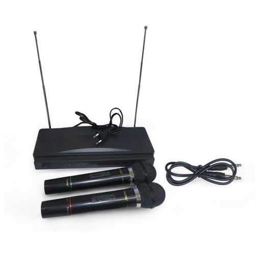 Mic / Mikropon / Microphone Double Wireless Homic Hm-306. Untuk yang suka karaokean Mic ini sangat cocok dipakai. Suaranya jernih dengan isi 2 didalamnya sehingga bisa nyanyi berdua (duet). Dengan sistem wireless yang bisa dibawa kemana-kemana. Cocok digunakan untuk acara dalam maupun luar ruangan.Freq Carrier : VHF 180-270 MhZ, Stabilitas Freq : 80dB, Suara BandHz-18KhZ, Suara Output :0 - 400m.