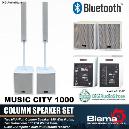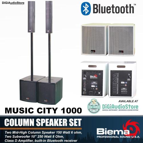 Biema Music City series features two models, Music city 800 and Music city 1000, All four systems have class D amplification, housed in the sub-woofer. The rear panel provides input for a stereo line signal, individual column speaker and sub output controls as well as a wireless signal input by Bluetooth.