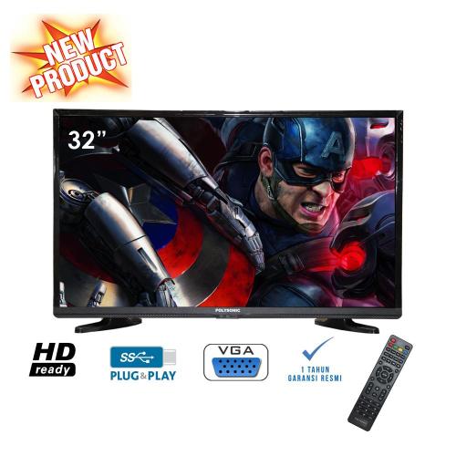 Polysonic LED TV 32 Inch terbaru Slim desain dan Wide Screen hard panel dengan Resolusi HD 1366x768 memiliki 3 fungsi bisa sebagai TV / Monitor / Multimedia ,memilki display warna 16.7M.